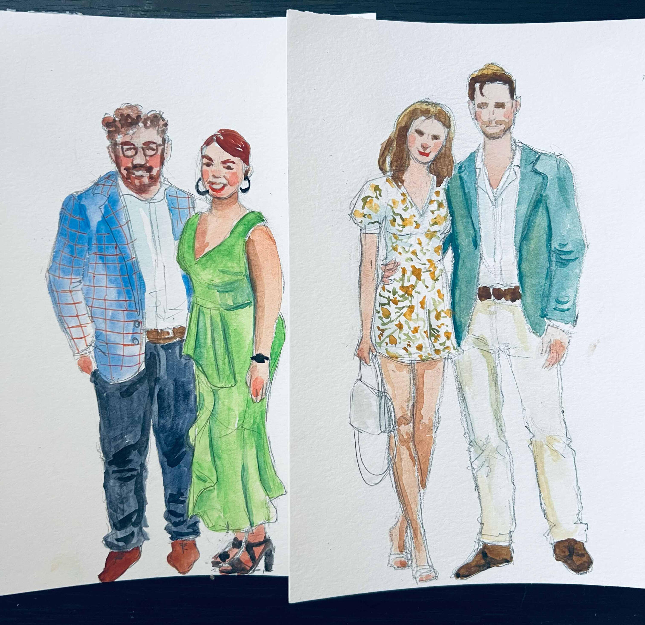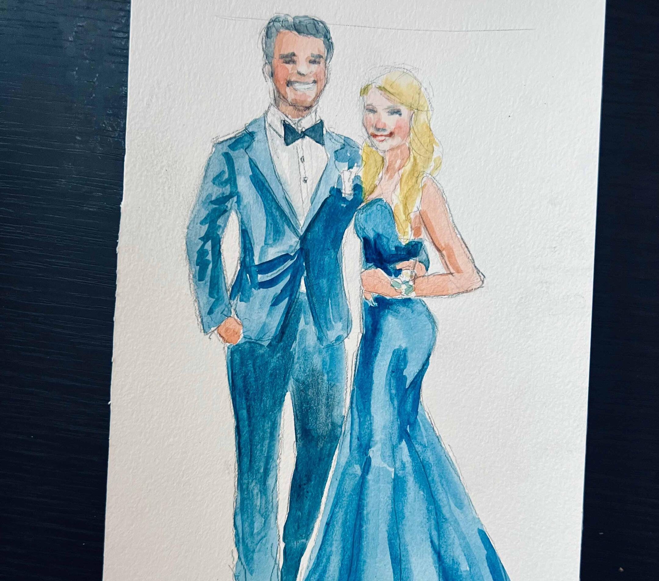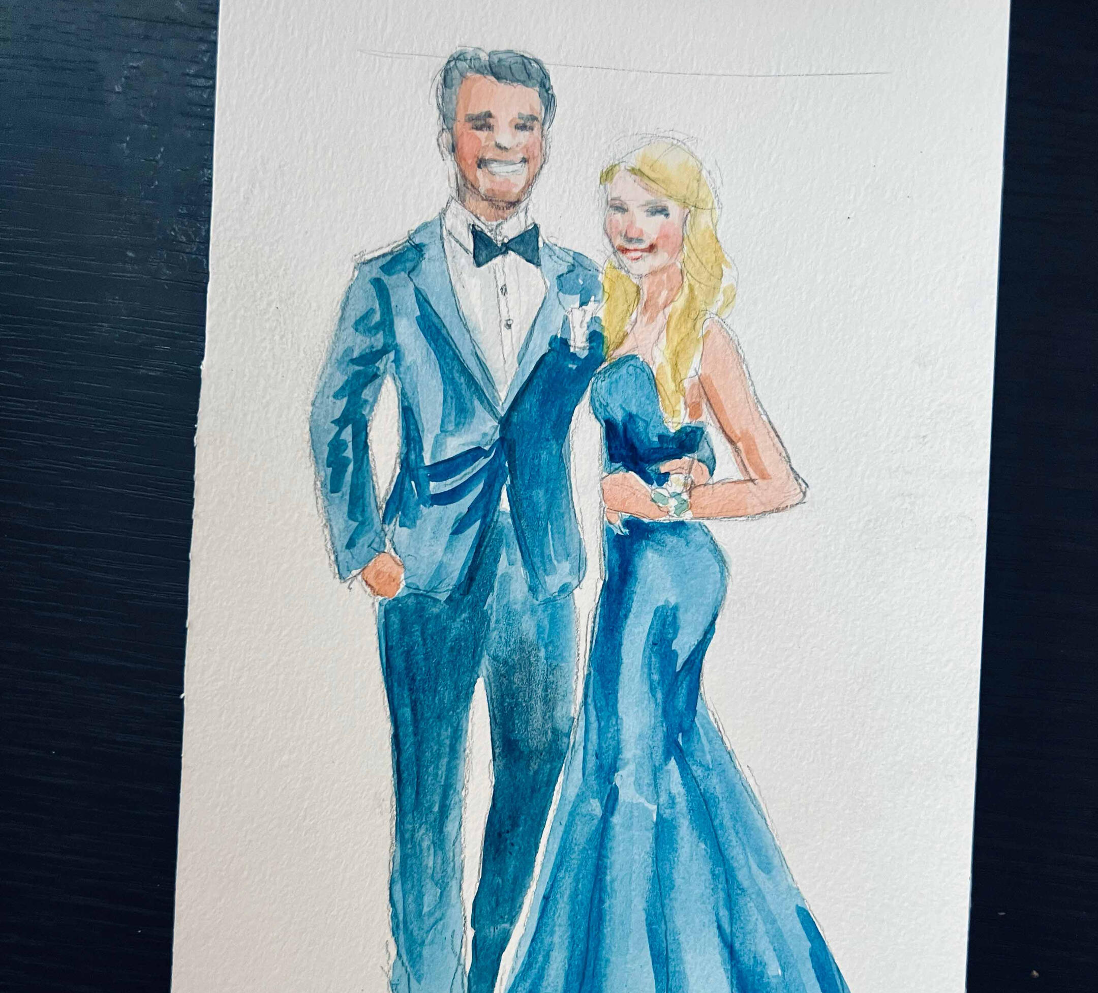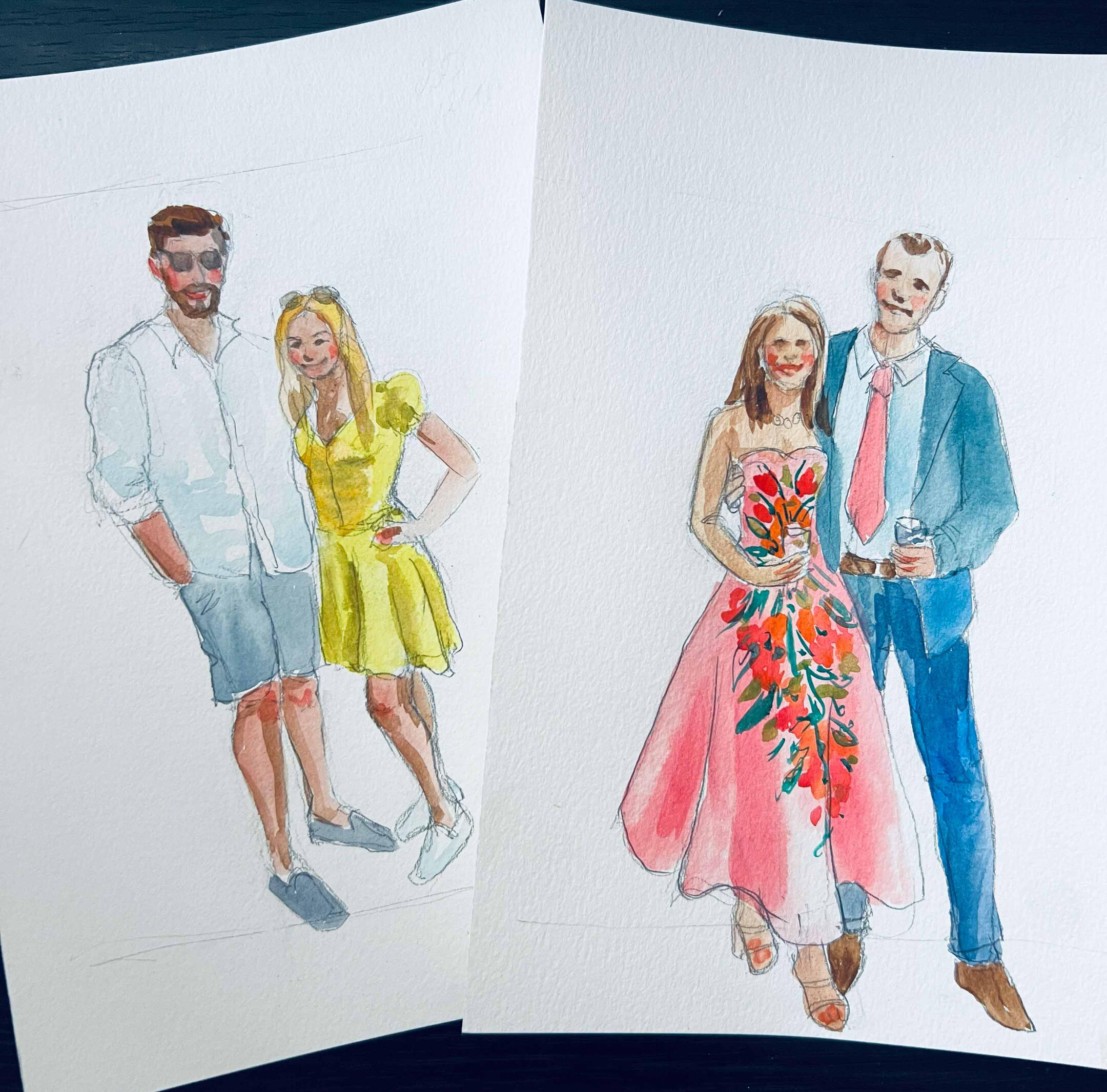 I arrive 15–30 minutes before guests to set up and get ready. As guests arrive, I’ll take a quick photo and note their name—then they’re free to enjoy the celebration. Guests are welcome to stop by anytime to watch the artwork come to life, but no one needs to wait or stand in line.Once photos are taken, I begin painting right away. Portraits are created in a quick, expressive watercolor sketch style on 5×7 paper. Each finished piece is placed in a protective sleeve so guests can take it home safely.During live painting, I typically complete 6–10 portraits per hour, depending on event flow. For packages that include post-event completion, any portraits not finished on-site are completed in-studio from photo reference and delivered within 2 weeks.