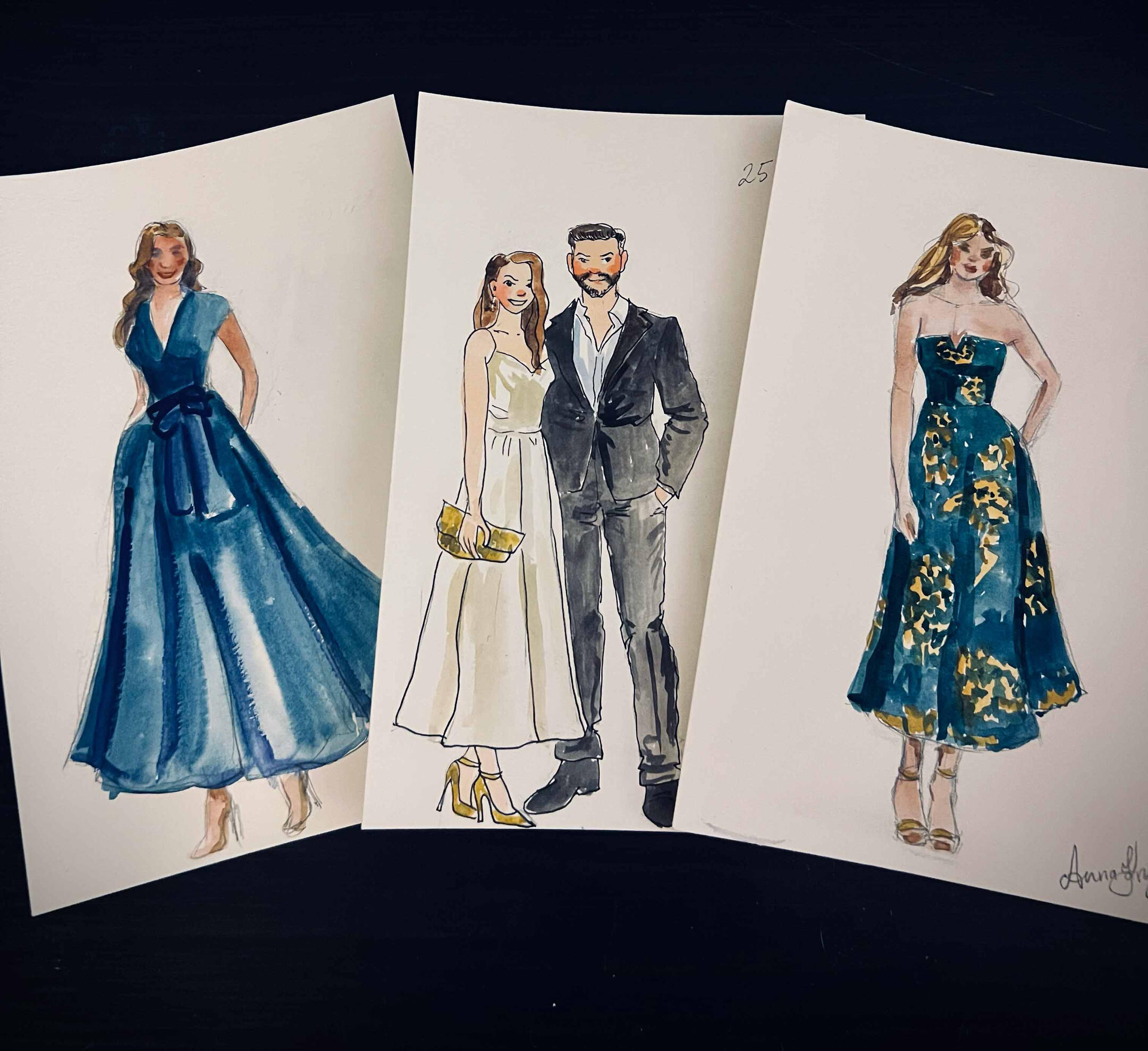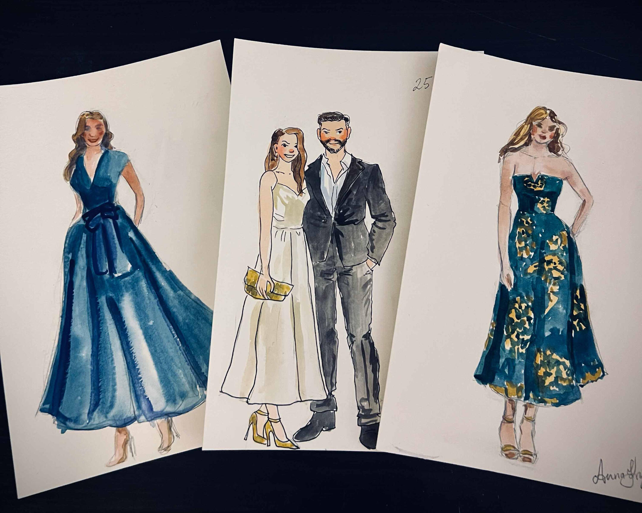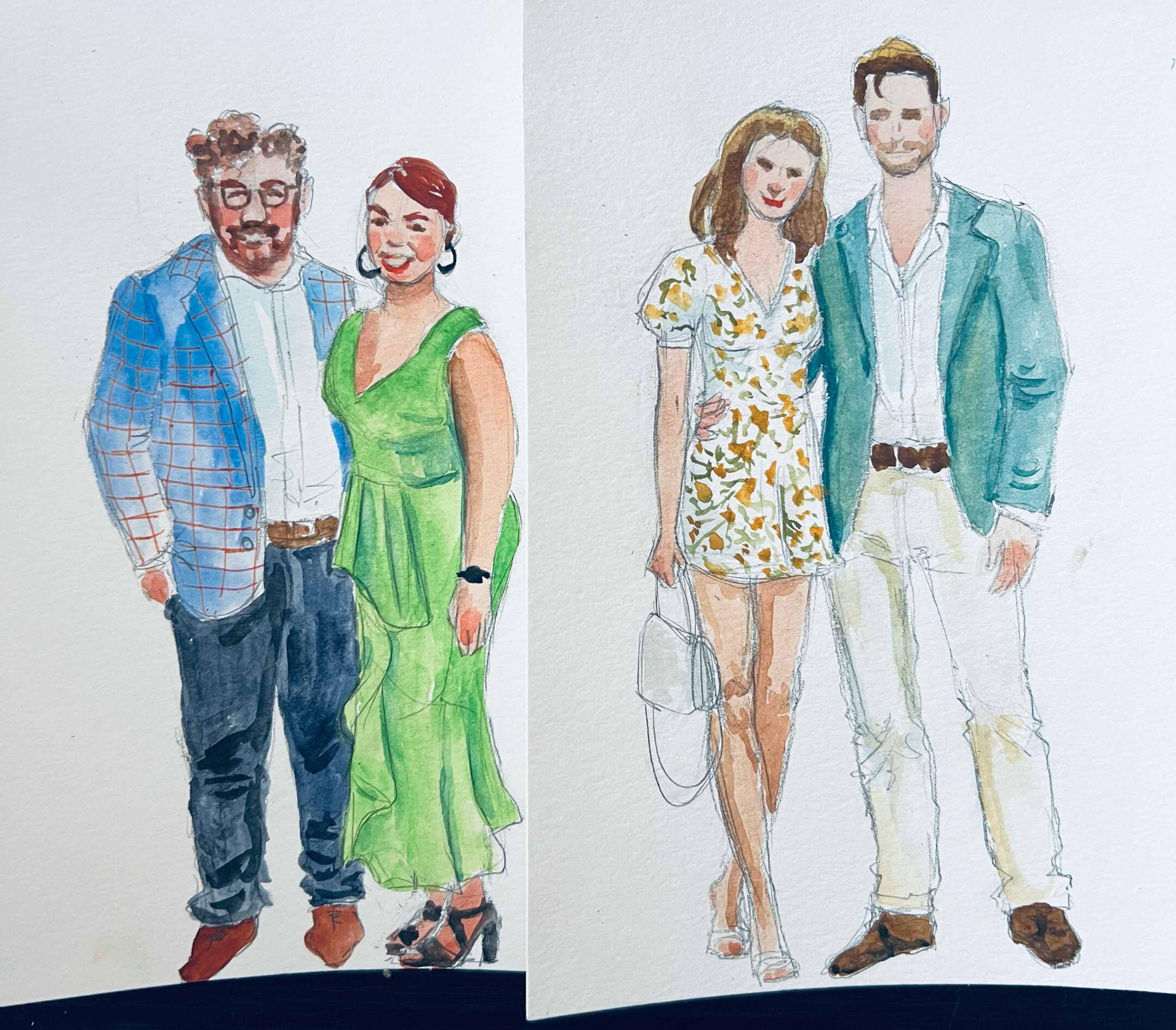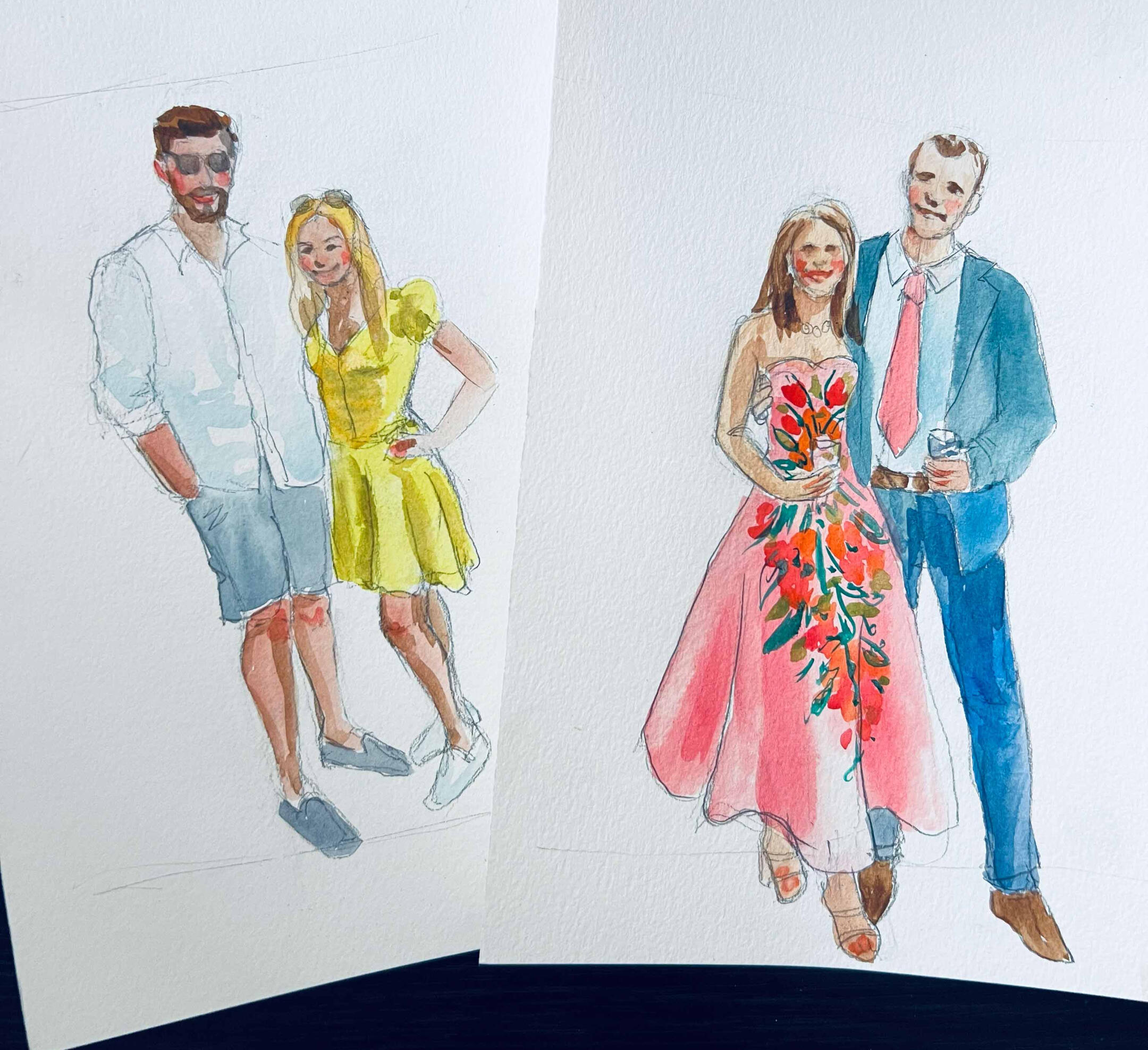 I arrive 15–30 minutes before guests to set up and get ready. As guests arrive, I’ll take a quick photo and note their name—then they’re free to enjoy the celebration. Guests are welcome to stop by anytime to watch the artwork come to life, but no one needs to wait or stand in line.Once photos are taken, I begin painting right away. Portraits are created in a quick, expressive watercolor sketch style on 5×7 paper. Each finished piece is placed in a protective sleeve so guests can take it home safely.During live painting, I typically complete 6–10 portraits per hour, depending on event flow. For packages that include post-event completion, any portraits not finished on-site are completed in-studio from photo reference and delivered within 2 weeks.